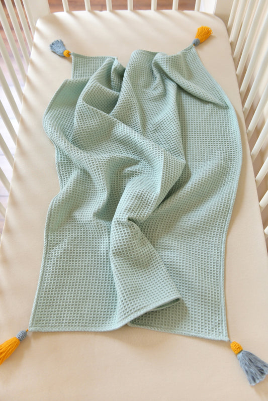 Aqua Waffle Weave Cotton Knit Blanket With Boho Tassels