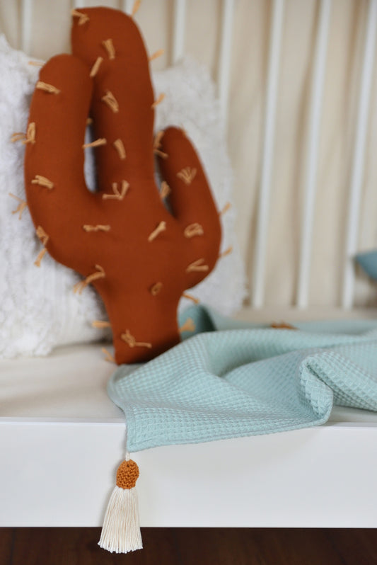 Aqua Waffle Weave Cotton Knit Blanket With Rust Boho Tassels
