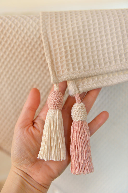 Ivory Waffle Weave Cotton Knit Blanket With Boho Tassels